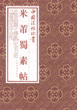 米芾《蜀素帖》,为米芾自咏五言诗四首、七言诗四首,绢本,行书,纵二十七点八厘米,横二七〇点八厘米,计七十一行,五百五十六字,今藏台北故宫博物院。此蜀素乃北宋庆历四年(一○四四)东川造,林希(子中)装裱成卷,记其尾虚其首以贮属善书者。熙宁八年(一○七五)胡完夫等观于林家,亦只题其尾。至元祐三年(一○八八)九月廿三日始为米芾所书。钤有『项元汴印』『高士奇』『王鸿绪印』等鉴藏印。帖前清高宗乾隆签题『米芾书蜀素帖』六字,帖后有胡完夫、董其昌、沈周、祝允明等跋,文征明、陈巘等观款。本书取经折装影印,原色原大,可窥原作精神。